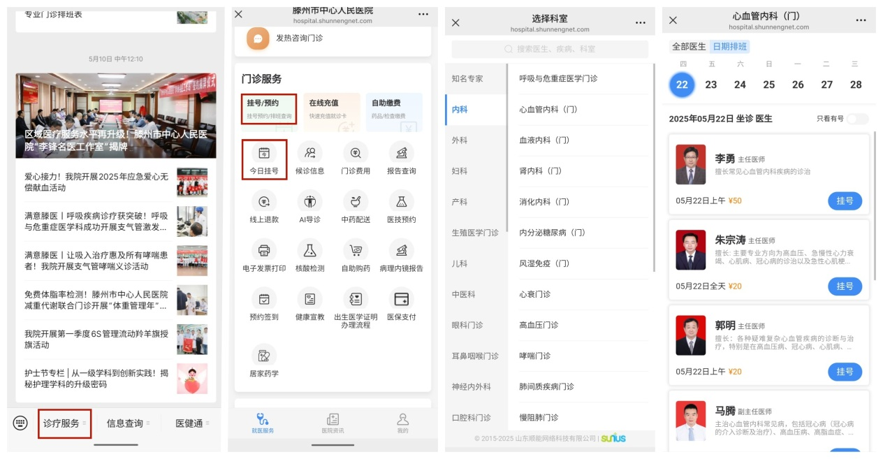 (1)線上預(yù)約:微信或支付寶搜索(滕州市中心人民醫(yī)院);點(diǎn)擊“診療服務(wù)”→選擇“預(yù)約掛號(hào)”或“當(dāng)日掛號(hào)”。(每天7:00開始放號(hào),可預(yù)約當(dāng)天及未來(lái)7日的專家號(hào)和普通號(hào),約滿即止。)