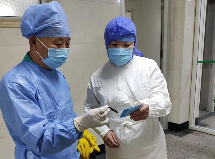 王貴菊說,護士是跟患者接觸最頻繁的。每次上班,他們都提前半小時到崗,穿上防護服,耐心、細心呵護每一位患者。穿著防護服,帶著兩層口罩,呼吸不暢,護目鏡起霧甚至滴水,很快就讓人汗流浹背、喉嚨干啞。由于穿著防護服,工作期間不能上廁所,大家都得提前半天禁水禁食,但同志們沒喊過一句苦。我是護士長,別的護士都看著我呢,我更要以身作則。