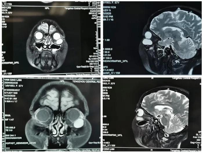 患者,女,65歲。因“發(fā)現(xiàn)左眼眶內(nèi)腫物3月”于5月24日收入眼二科病房。入院行眼眶CT、MRI檢查,術(shù)前閱片發(fā)現(xiàn)該患者左眼眶內(nèi)腫物,體積大,位置較深,邊界清,直徑約3.0cm類圓型腫物,與下直肌有粘連。