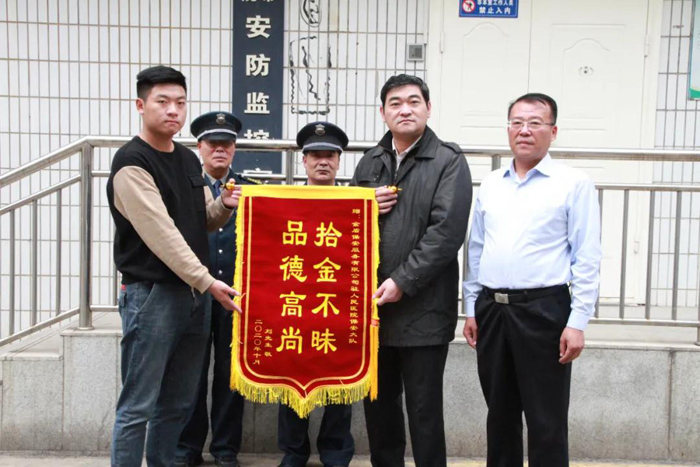 失主劉輝龍萬(wàn)分感激,拿出現(xiàn)金要感謝拾到錢(qián)包的保安隊(duì)員李書(shū)彥,被大隊(duì)長(zhǎng)司增紅拒絕。失主劉輝龍給滕州市金盾保安公司駐人民醫(yī)院保安大隊(duì)送錦旗一面,書(shū)寫(xiě):拾金不昧 品德高尚。(司增紅)