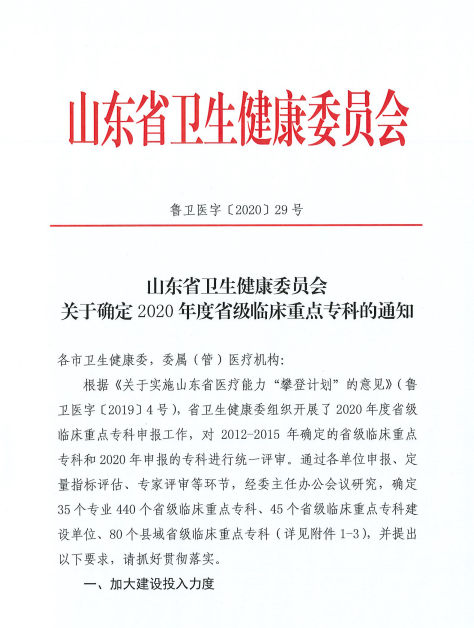 2020年度省級臨床重點??圃u審,系山東省衛(wèi)健委根據(jù)《關于實施山東省醫(yī)療能力“攀登計劃”的意見》等要求,按照動態(tài)管理原則,對2012-2015年確定的省級臨床重點專科和2020年申報的??七M行統(tǒng)一評審,通過各單位申報、定量指標評估、專家評審、衛(wèi)健委主任辦公會議研究等程序確定,是推進全省??平ㄔO水平和醫(yī)療服務能力持續(xù)提升,打造醫(yī)學高地的重要舉措。