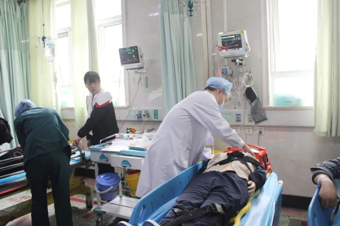 院前急救隊(duì)迅速出動(dòng),由第一輛到達(dá)救護(hù)車張慶省醫(yī)師任現(xiàn)場(chǎng)指揮,立即分類檢傷,指揮其他急救隊(duì)員依次對(duì)6例患者分別迅速開展心肺復(fù)蘇、氣管插管、電除顫、止血包扎與骨折固定、脊髓損傷固定與搬運(yùn)等院前急救措施,妥善處置后積極與院內(nèi)匯報(bào),迅速轉(zhuǎn)運(yùn)。