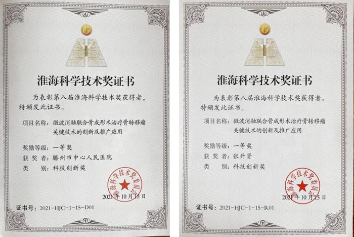 11月16日,第八屆淮??茖W(xué)技術(shù)獎(jiǎng)揭曉,由我院腫瘤科張開賢主任醫(yī)師領(lǐng)銜完成的項(xiàng)目“微波消融聯(lián)合骨強(qiáng)化術(shù)治療骨轉(zhuǎn)移瘤關(guān)鍵技術(shù)的創(chuàng)新與推廣應(yīng)用”獲得一等獎(jiǎng)。據(jù)悉,這是棗莊地區(qū)首個(gè)獲得淮??茖W(xué)技術(shù)獎(jiǎng)一等獎(jiǎng)的醫(yī)學(xué)項(xiàng)目。