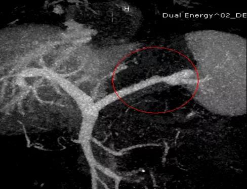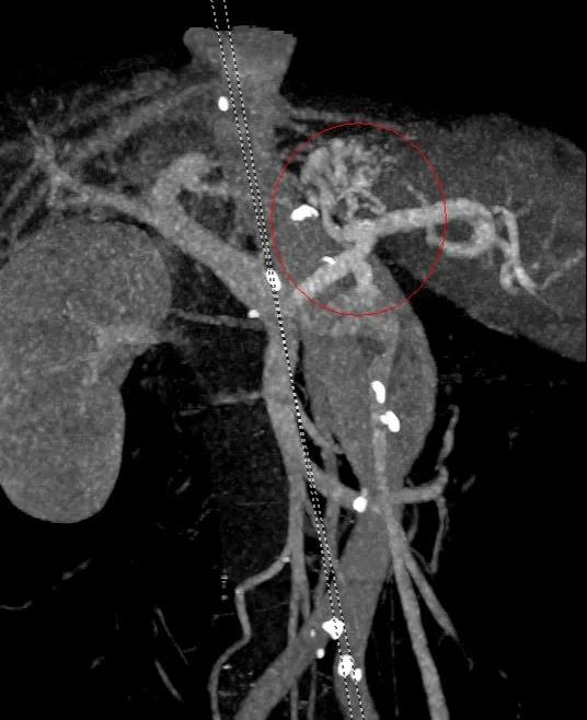 科室組織術(shù)前討論,共同讀片,分析:該患者巨大胃底靜脈曲張存在胃脾分流道,巨大者難以套扎,常規(guī)組織膠血管內(nèi)注射治療易引起異位栓塞。術(shù)前CT門脈成像檢查清晰顯示靜脈團(tuán)的血管走行及血管的出入口大致在胃底的位置,鈦夾夾閉可以先行阻斷或減緩血流,隨后的組織膠治療不易發(fā)生異位栓塞。于是,團(tuán)隊(duì)決定采用目前最新的鈦夾限流聯(lián)合組織膠栓塞術(shù)處理該患者的胃底曲張靜脈。
