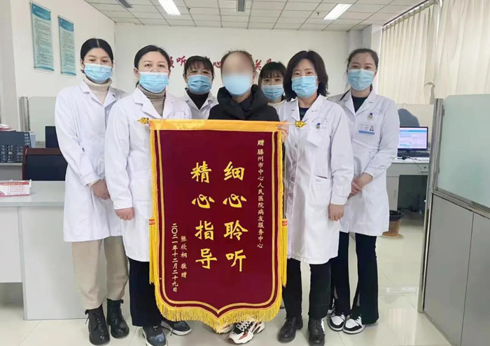 張女士和家人非常感激、感謝病友服務(wù)中心的老師們,感謝她們的細(xì)心聆聽和給予的精心指導(dǎo),特意做了一面錦旗,以表謝意!祝福病友服務(wù)中心的老師們工作順利,身體健康;祝福滕州市中心人民醫(yī)院在以后的工作里,蒸蒸日上,美名遠(yuǎn)揚(yáng)!(王玉敏)