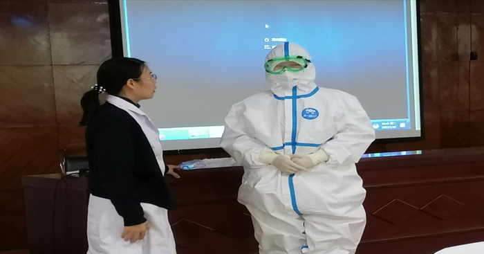 1月18日,感染科王貴菊護(hù)士長(zhǎng)和感染管理科孫玲副主任對(duì)發(fā)熱門診、隔離病房的布局流程、工作要求、相關(guān)院感防控等知識(shí)進(jìn)行培訓(xùn)。孫玲親自指導(dǎo)后備人員穿脫防護(hù)用品,理論與實(shí)踐相結(jié)合,保證護(hù)理人員接受培訓(xùn)后能應(yīng)用于臨床實(shí)踐。