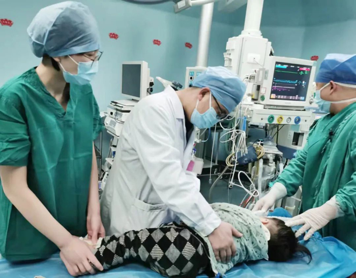 時間就是生命,搶救患兒分秒必爭!劉尚耀醫(yī)師立即聯(lián)系手術(shù)室,啟動急診綠色通道,給予患兒球囊輔助呼吸,和急診科護(hù)師葛瑤、張后維一路飛奔,將患兒護(hù)送至手術(shù)室內(nèi)。