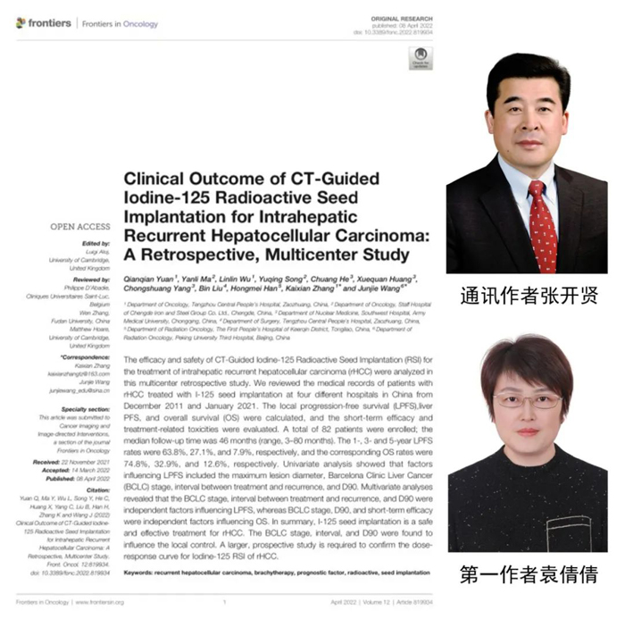 近日,由我院腫瘤一科牽頭,聯(lián)合國內(nèi)4家醫(yī)院共同完成的放射性粒子治療肝癌的多中心研究“The efficacy and safety of CT-GuidedIodine-125 Radioactive Seed Implantation?。≧SI) for the treatment ofintrahepatic recurrent hepatocellular carcinoma”發(fā)表在國際期刊Frontiers in Oncology(2區(qū)/IF6.24)。第一作者袁倩倩,通訊作者張開賢。