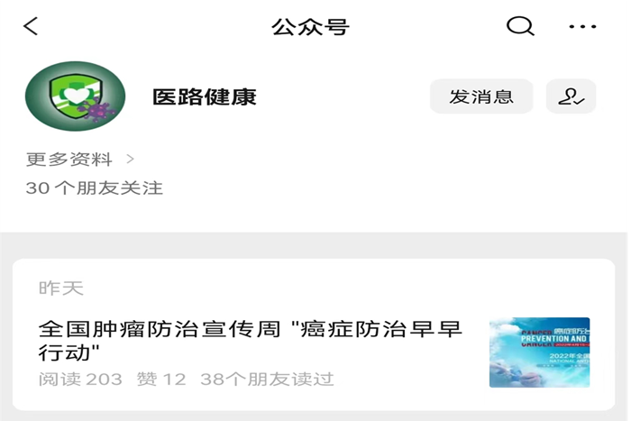 青年醫(yī)生發(fā)揮黨員先鋒模范作用,充分利用科室微信公眾號(hào)“醫(yī)路健康”作為載體平臺(tái),推送腫瘤防治知識(shí)幻燈片,病友講座相關(guān)視頻,獲得了讀者的互動(dòng)反饋,對(duì)患者及高危人群的居家醫(yī)療起到了重要的橋梁作用。