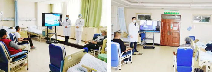 為提高活動(dòng)的宣傳廣度和效果,腫瘤三科設(shè)計(jì)了宣傳海報(bào),印制并發(fā)放宣教手冊(cè),同時(shí),以國(guó)家癌癥中心推出的“中國(guó)居民癌癥防控平臺(tái)APP”和“癌癥篩查早知道微信小程序”為載體,利用移動(dòng)可視平板進(jìn)病房播放腫瘤科普幻燈片,在科室微信公眾號(hào)推送科普視頻并在線答疑、義診。