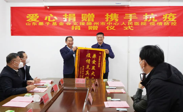 楊位明向滕州市中心人民醫(yī)院捐贈(zèng),邢佑文代表滕州市中心人民醫(yī)院接受愛心捐贈(zèng),同時(shí)將一面印有“兼愛顯大愛 疫情見真情”的錦旗贈(zèng)送給山東墨子基金會(huì)。