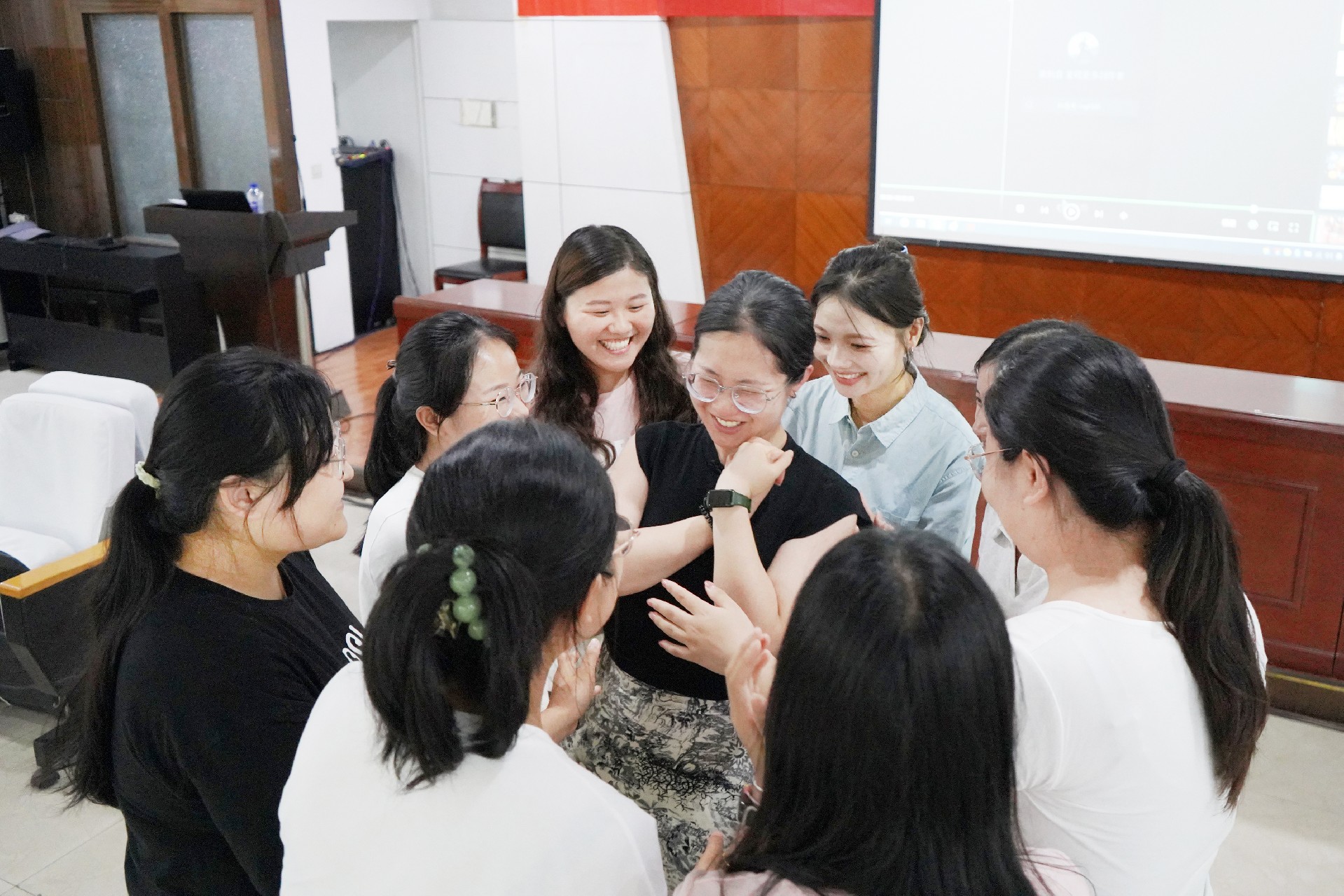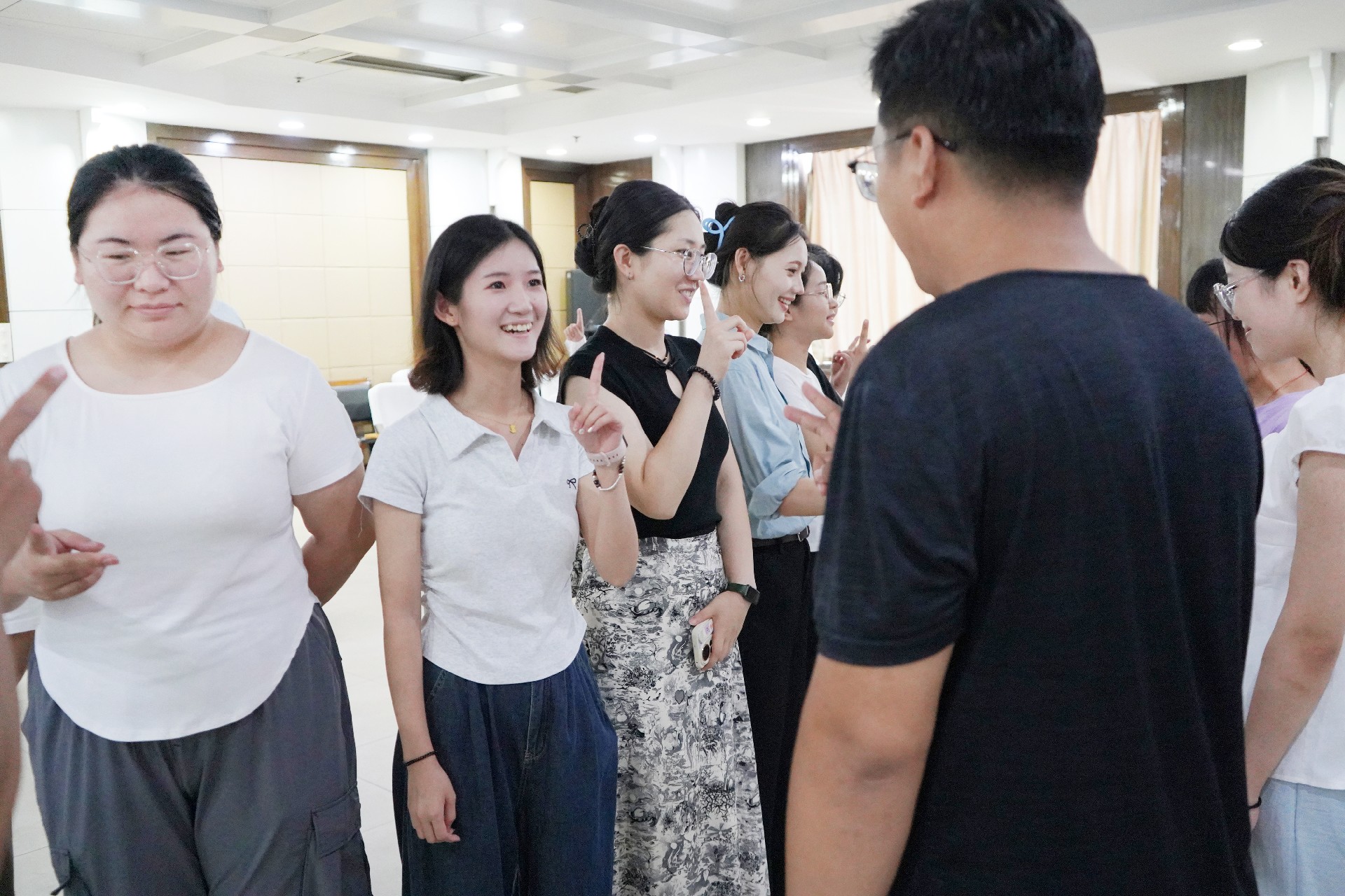 隨著“桃花朵朵開”歡快的音樂響起,團體成員們根據(jù)要求“桃花開幾朵”自由分組,組內(nèi)成員面對面邀請對方把手搭在彼此肩膀上,開始自我介紹“我叫…我畢業(yè)于…學校和專業(yè)/我是一個…的人”,在歡聲笑語中大家互相認識了解,建立了信任、開放、坦誠的氣氛。