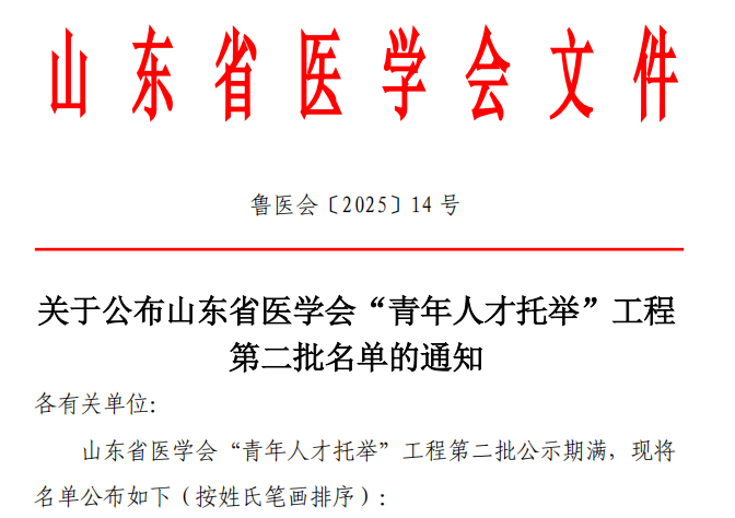 山東省醫(yī)學(xué)會第二批 “青年人才托舉工程” 名單公布,我院兩名醫(yī)師榜上有名!