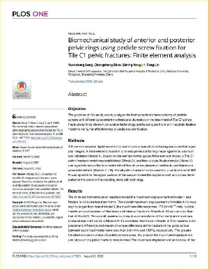 近日,由我院創(chuàng)傷一科團隊牽頭的關于不同置釘方式和直徑的椎弓根螺釘治療TileC1型骨盆骨折的生物力學研究成果“BiomechanicalstudyofanteriorandposteriorpelvicringsusingpediclescrewfixationforTileC1pelvicfractures:Finiteelementanalysis”,在國際JCRQ2區(qū)期刊雜志≤PloS