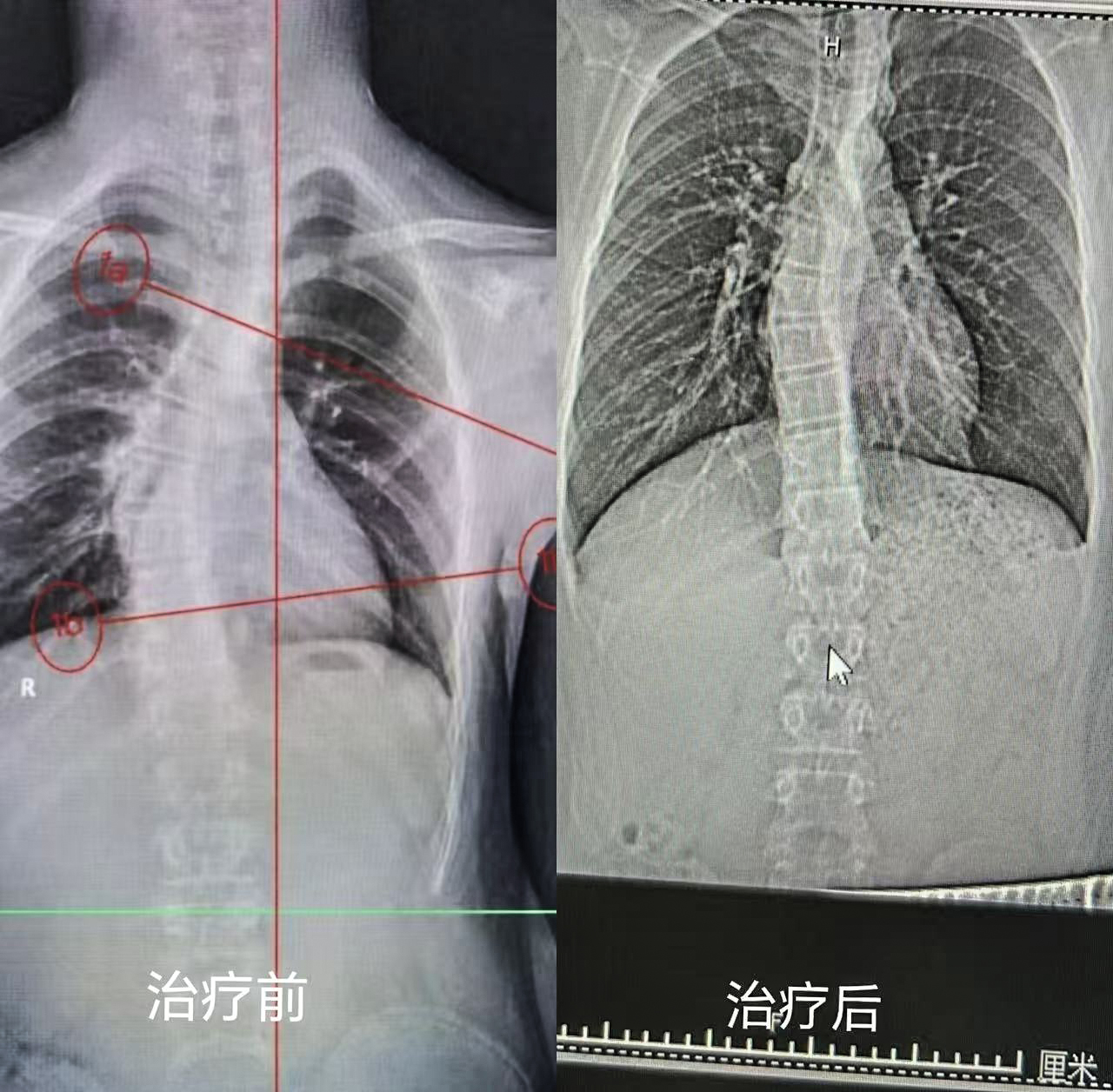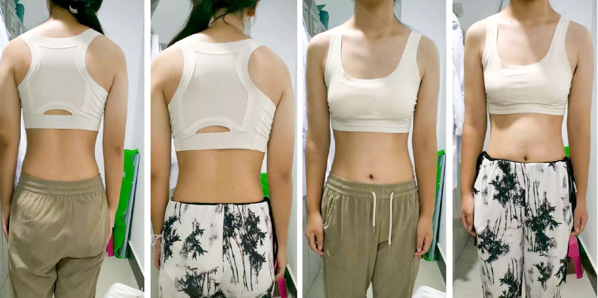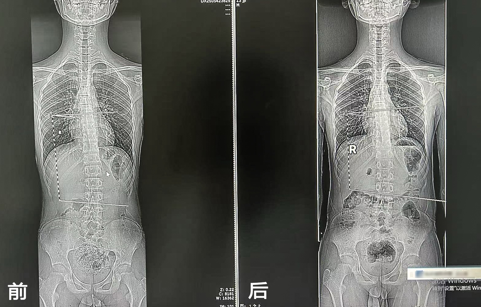 患者,女,13歲。2024年在滕州市學(xué)生常見?。ㄋ姆廊M(jìn))防控專家進(jìn)校園活動(dòng)中查體發(fā)現(xiàn)體態(tài)異常,含胸駝背、剃刀背明顯,脊柱側(cè)彎(T8-L3:13°)。每周在我院康復(fù)醫(yī)學(xué)科行康復(fù)訓(xùn)練一次,經(jīng)過4個(gè)月康復(fù)訓(xùn)練,復(fù)查脊柱側(cè)彎(T8-L3:8°),含胸駝背體態(tài)較前改善明顯。
