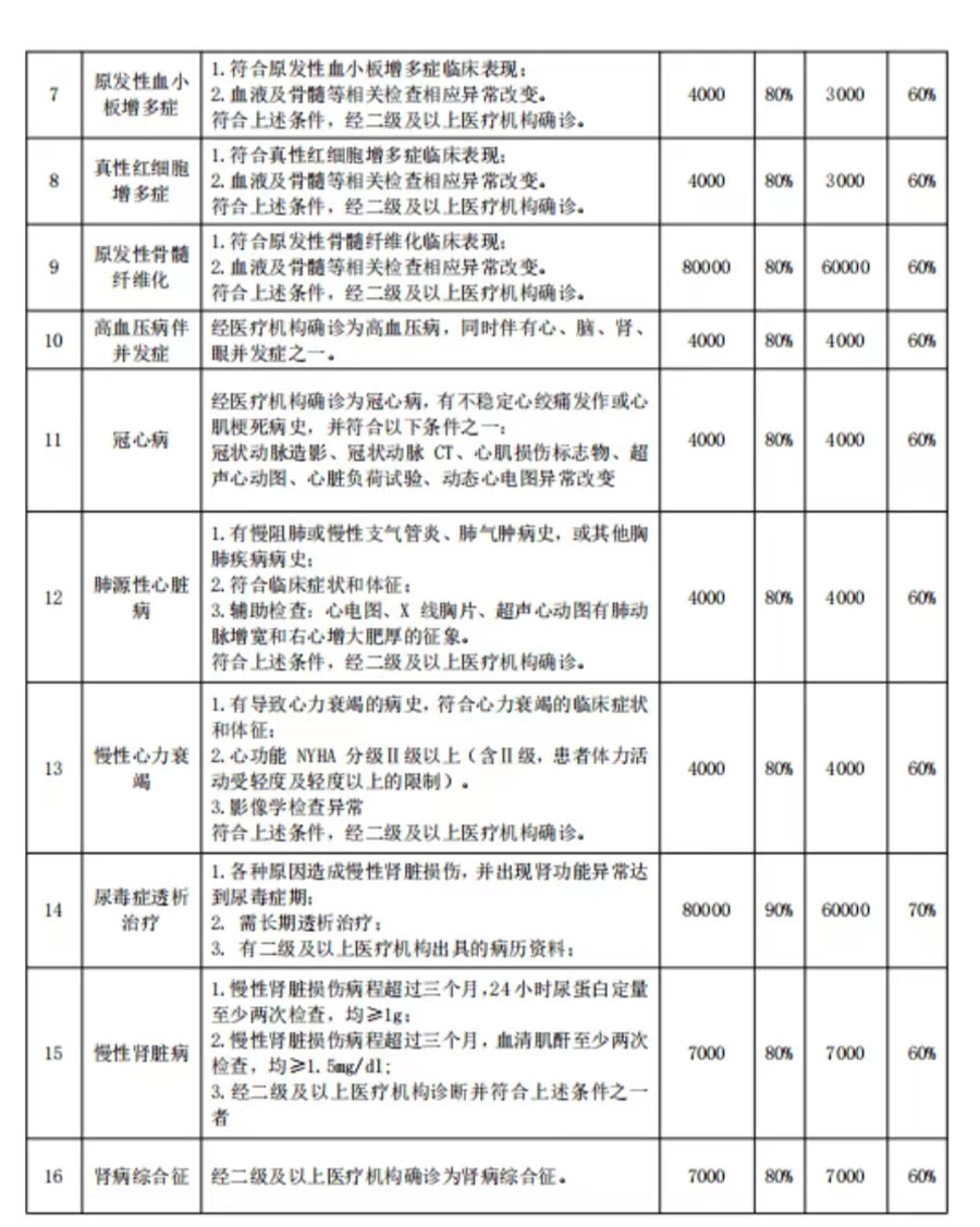 或器官移植(抗排異治療)、尿毒癥透析治療等病種支付比例為 90%,其余病種支付比例為 80%;參保居民惡性腫瘤的門診治療、白血病、組織或器官移植(抗排異治療)、血友病等病種支付比例為70%,其余病種支付比例為 60%。