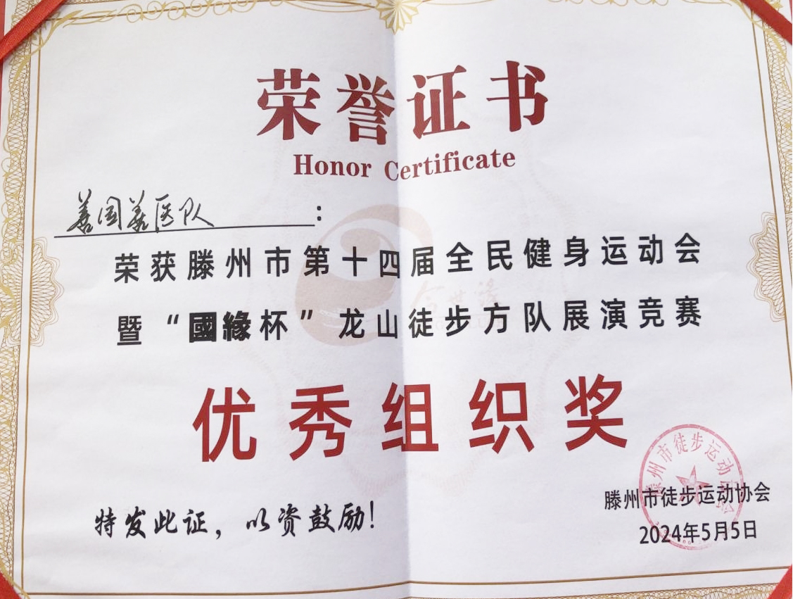 此次活動由滕州市體育總會主辦,總路程10公里,共有26個方隊700余人參加。我院“善國善醫(yī)健走隊”27人代表參加展演,最終獲得第十名及優(yōu)秀組織獎。