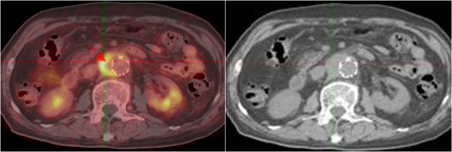 老年男性,反復(fù)發(fā)熱1年余;10年前因主動脈夾層行支架植入。PET/CT顯示支架周圍主動脈管壁增厚,代謝明顯增高,診斷為支架周圍感染。