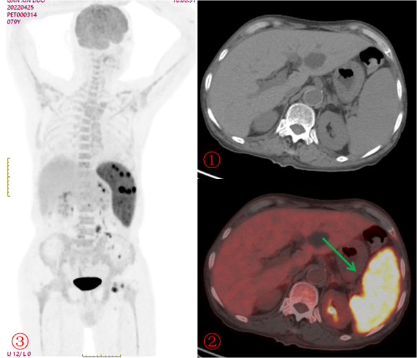 老年男性,發(fā)熱半月,全身CT未見確切異常。PET/CT示脾臟增大伴代謝明顯不均質(zhì)增高(圖2?綠箭),腹盆腔部分略大淋巴結(jié)伴帶代謝增高,診斷為淋巴瘤,病理證實(shí)為小B細(xì)胞淋巴瘤。