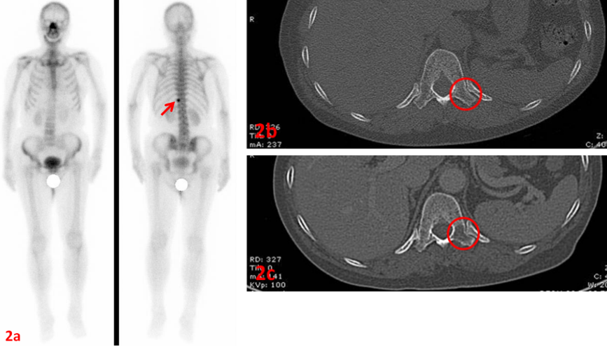 老年女性,右肺腺癌。ECT示T11左側(cè)橫突(圖2a紅箭)代謝異常,考慮骨轉(zhuǎn)移,同期CT檢查未見明顯異常(圖2a紅圈)。