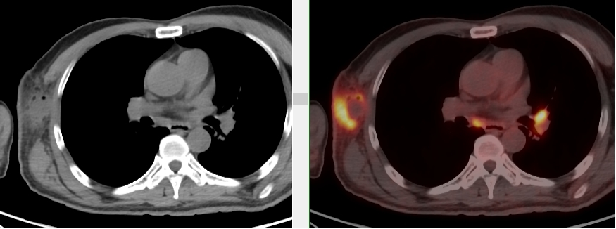 PET/CT引導(dǎo)下微創(chuàng)經(jīng)皮生物靶區(qū)活組織檢查術(shù)專家共識(中華醫(yī)學(xué)會核醫(yī)學(xué)分會,2017版):PET/CT具有功能顯像、全身顯像的特點(diǎn),可一次性完成全身分期,有利于選擇最安全、最高臨床分期病灶取樣病理活檢;可區(qū)分腫瘤活性部位和壞死部位,準(zhǔn)確取樣,避免無效活檢。