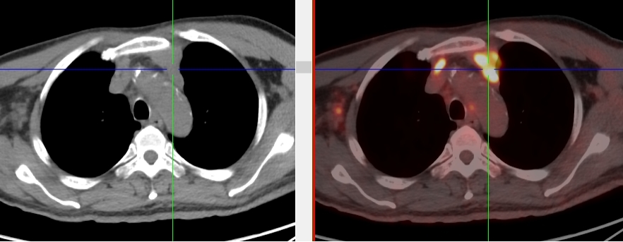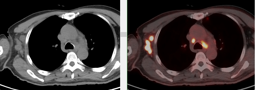 本例為罕見病理類型的腫瘤,影像學(xué)表現(xiàn)無明顯特異性,診斷困難。強(qiáng)化CT和穿刺病理已基本明確為惡性腫瘤,行PET/CT檢查一是為了全身檢查,完善分期,二是根據(jù)PET代謝情況指導(dǎo)進(jìn)行生物靶區(qū)活檢,進(jìn)一步明確病理診斷。最終,PET/CT除縱隔病變外發(fā)現(xiàn)更多頸胸部淋巴結(jié)代謝異常,綜合考慮后對腋窩淋巴結(jié)進(jìn)行切除活檢,最終得到病理證實(shí)。