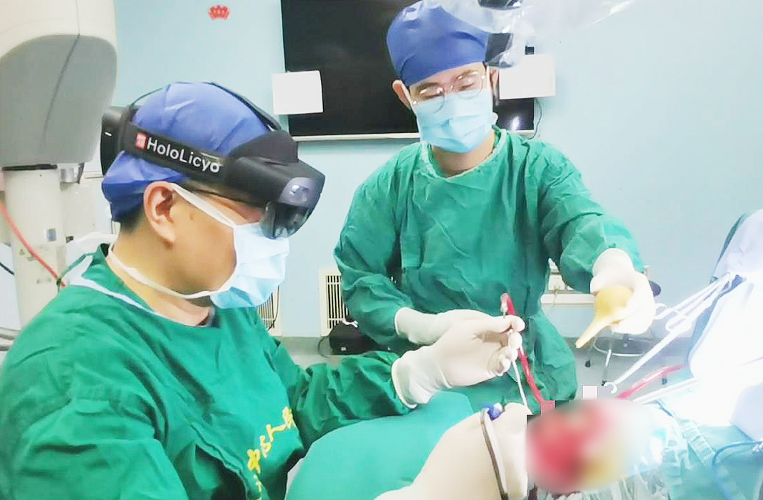 手術(shù)醫(yī)生佩戴著MR(Mixed Reality,混合現(xiàn)實(shí))眼鏡,獲取顱腦病變的全息影像,在超高清手術(shù)顯微鏡下,一個(gè)巨大的顱內(nèi)外溝通性腫瘤被完美切除。這猶如科幻電影中的場(chǎng)景,真實(shí)發(fā)生在我院手術(shù)室的一臺(tái)復(fù)雜腦腫瘤手術(shù)中。